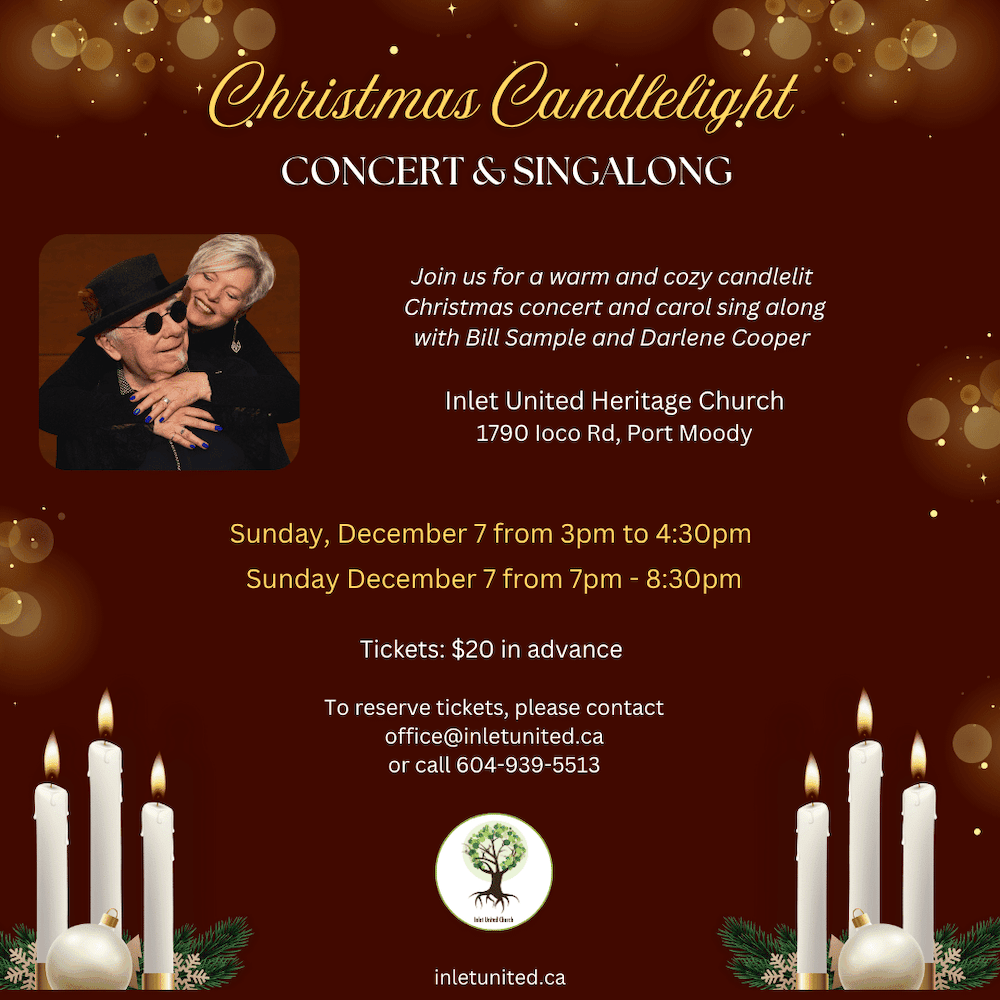 Come enjoy a warm and cozy candlelit evening of Christmas music and join in with a carol singalong in this beautiful heritage church on Ioco Rd.  Bill Sample and Darlene Cooper of the Wild Blue Herons will be performing and leading the audience in singing well-known Christmas songs.